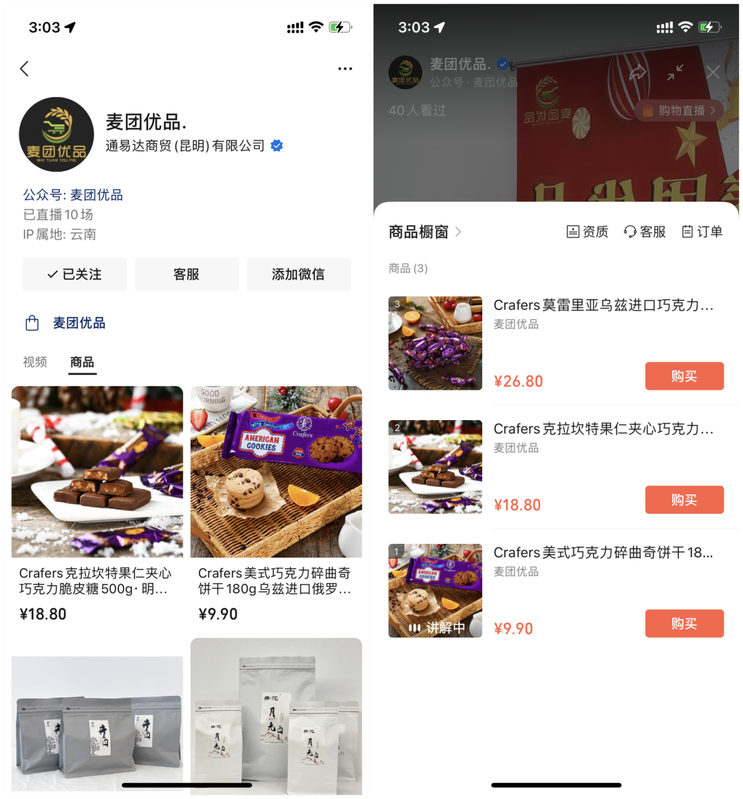 麦团优品用视频号开启品牌自播,从直播到销售的整个环节,都是在自己的私域流量池完成,减少不必要的用户流失,小程序商城内的商品,可以直接上架到视频号直播间,开启带货,从而提高私域的成交转化。